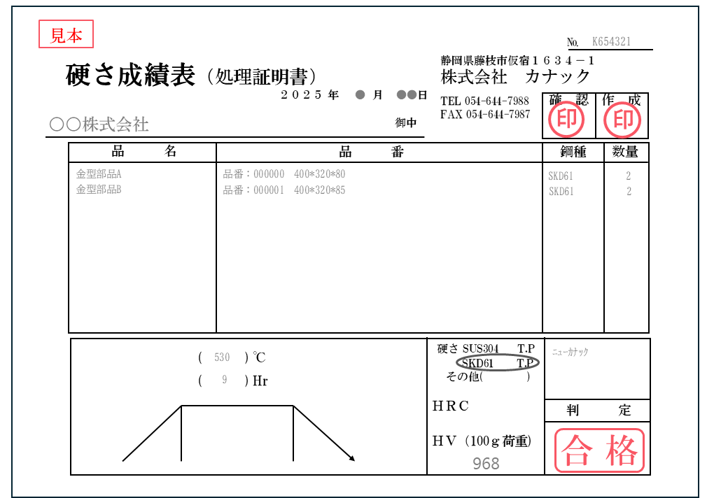 A:『硬さ成績表(処理証明書)』の発行が可能です。ご依頼時、注文書等で “硬さ成績表希望” “処理証明書希望” とお伝えください。