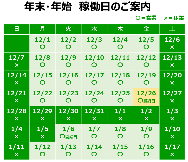 休業期間中(12/27~1/5)にいただいたお問合せについては、営業開始日より、順次回答させていただきます。